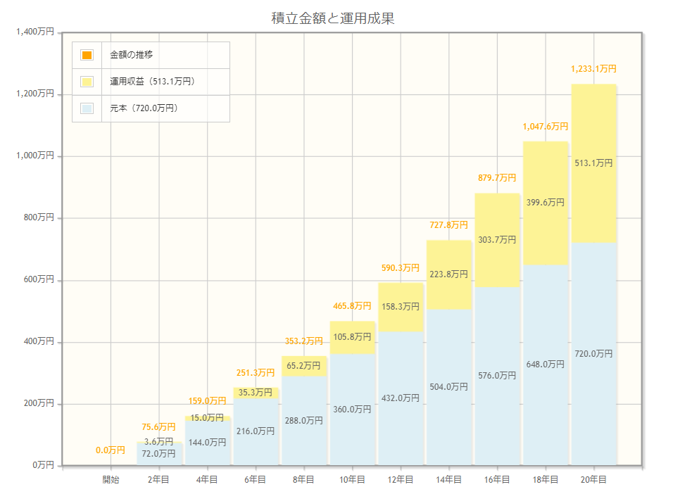 5%で運用できると、積立額は720万円が→1,233万円 になるのです。