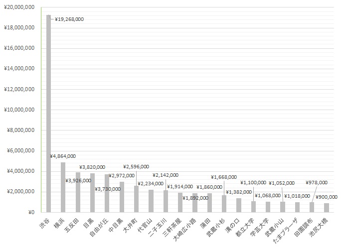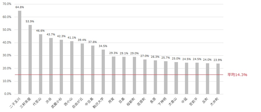 マイナスを記録したのは1駅、それ以外は上昇率0%以上を記録しました。平均は14.3%となり、前後±5%内で約2/3を占めます。全国的には2.5%の上昇率とのデータもありますので、東急沿線の上昇率は高い部類に入ると言えます。