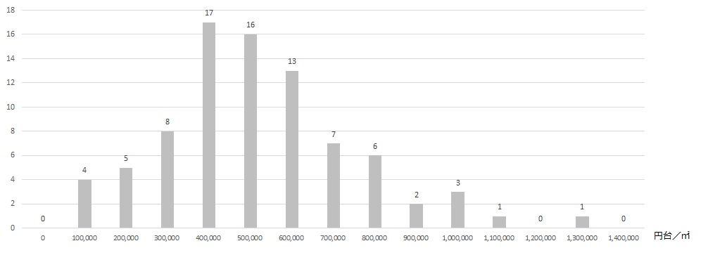 上位は商業地のイメージが強い駅がランクインしますが、東急線全体でみるとどうでしょうか。仮に1,500,000円/㎡を超す駅は全96駅中13駅です。残りの83駅の分布を表したものが下記グラフです。400,000~600,000円台/㎡の駅が多いことが分かります。なお、96駅の中央値は568,000円/㎡になり、中央値に近いのは世田谷線上町駅、大井町線等々力駅になりました。