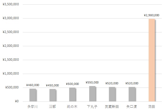 蒲田駅が突出して大きな値となり、2位の下丸子駅の約5.5倍になります。蒲田駅を除く6駅は近い数値となり、2位の下丸子駅と7位の沼部駅の差はわずか100,000円/㎡しかありません。これは他の路線を見ても珍しく、沿線内の住環境が比較的近いとも言えます。