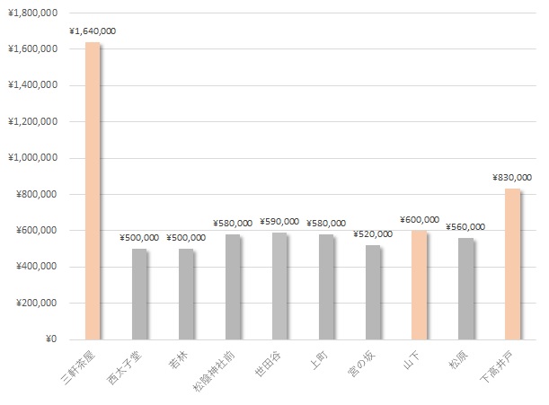 第1位の三軒茶屋駅は第2位の下高井戸駅の約2倍の値です。3位以下は500,000~600,000円/㎡のわずか100,000円/㎡の差しかありません。これは前回の東急多摩川線にも近い誤差で、東急多摩川線同様に世田谷線も沿線内の住環境がある程度統一されていること言えるのではないでしょうか。三軒茶屋駅周辺は商業地域ですが、それ以外は高層建物の少ない住宅街のエリアであることも特徴です。そのため、大規模な開発が難しく今後しばらくは大きな環境変化は起きにくいのではないかと想定されます。