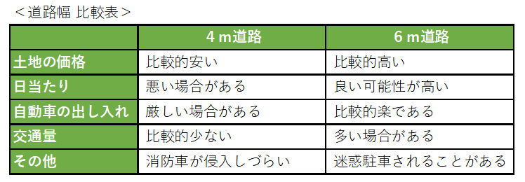 それでは、まず、道路の幅によるメリット・デメリットについて、住宅地の幅員4m道路と6m道路を比較してみましょう。