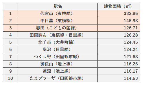 建物面積とは、各階の床面積を合計したもののことです。一般的には建物面積100㎡を確保できると3LDKか4LDKの間取りが納まると言われております。1位は代官山駅で、300㎡を超える値ですので、特殊物件が含まれそれが影響していると考えられます。2位は中目黒駅で代官山の隣の駅ですから、この周辺の物件は建物面積の大きいものが多いと言えそうです。3位は恩田駅で7位のつくし野駅と近いエリアになります。4位から6位の3駅は近接するエリアで、いずれも古くからの広い住宅街の名残があるのかもしれません。
