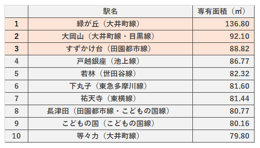 3位のすずかけ台駅は8位にランクインした長津田駅、9位のこどもの国駅の隣接駅ですので、このエリアも専有面積の広い物件が多く取引されているようです。