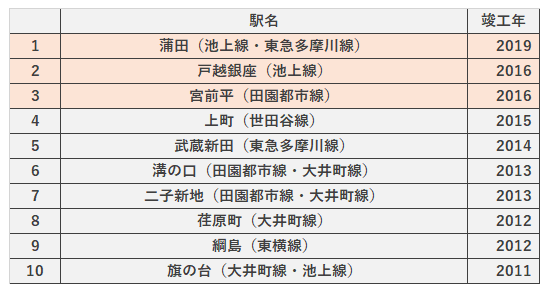 1位は蒲田駅で竣工年が2019年ですから、新築物件の取引が多かったと推測できます。2位の戸越銀座駅や8位の荏原町駅、10位の旗の台駅の周辺エリアは木密地域と呼ばれる古くからの木造住宅が多く存在し、近年不燃化建物への建て替えが多く進んでいることも要因かもしれません。また、3位の宮前平駅、6位の溝の口駅、7位の二子新地駅など田園都市線のエリアはまだまだ宅地化が進んでいると言えそうです。