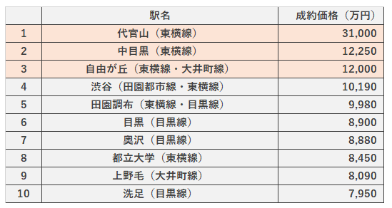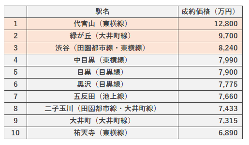 1位は代官山駅で、唯一億を超える価格になっています。上位10駅は全て都内ですが、より都心に位置する駅とも言えないのが特徴ではないでしょうか。また、特急や急行停車駅ではなく各駅停車駅も上位に位置しています。