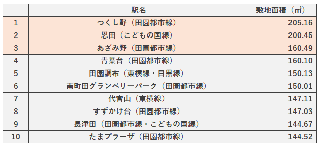 1位はつくし野駅、2位は恩田駅で建物面積の広い駅でもランクインしていた2駅です。このエリアは区画も広く、ゆったりとした街並みであることが特徴と言えます。また、上位10駅のうち7駅が田園都市線であることも特徴です。これは田園都市線沿線で多く定められている建築協定と呼ばれる規定の中で「敷地面積の最低限度」が定められているケースが多いことが影響しているようです。中には最低敷地面積150㎡という規定のエリアもありますので、厳しい規定であることが分かります。