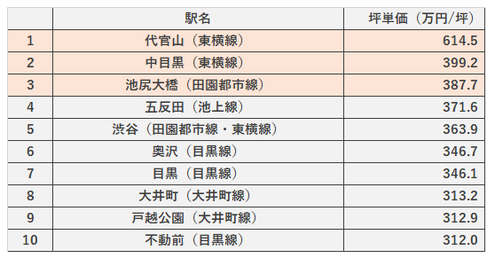 1位の代官山駅は飛びぬけており、600万円/坪を超えています。2位から10位は300万円台になっております。本データは中古マンションのみ、築年数問わず集計しておりますので、一般的に言われている新築マンションの販売坪単価とは200万円/坪前後の差があるかもしれませんね。