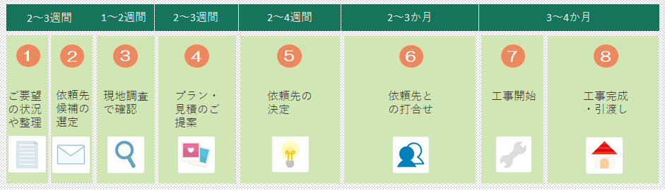 検討をはじめてから工事完成まで, 8か月~12か月かかることもあります。