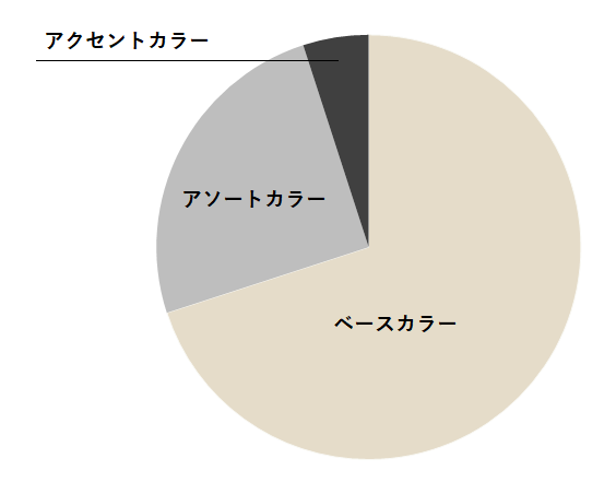 床や壁・天井などのお部屋全体の大きな面積を占める「ベースカラー」、カーテンやラグ・ソファなどインテリアのメインとなる「アソートカラー」、クッションやインテリア小物など差し色となる「アクセントカラー」の3つのカテゴリーに分けて色彩を検討するとスムーズです。