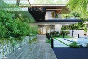 また、居室外壁の空間には地表付近の熱を居室へ影響を及ぼさないように、コンクリート打や金属製のデッキなどの熱を蓄積してしまう造作施工をあまり施さず、草木の植え込みなどを配置し、地表付近の温度を下げ水やりを兼ねた草木や地面への水打ちを施す事による気化熱の効果を利用し、さらに温度を下げるなどの工夫も可能です。