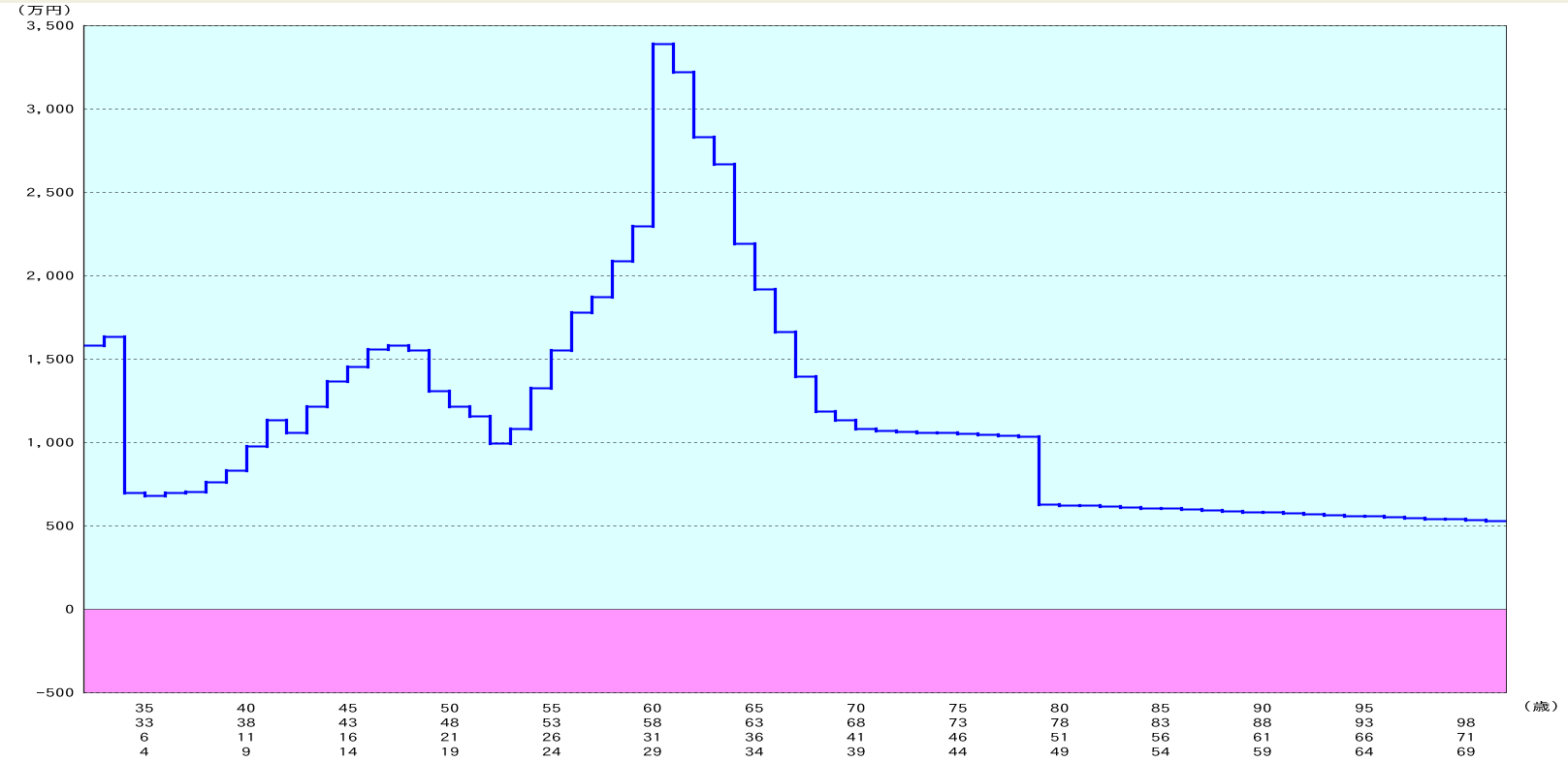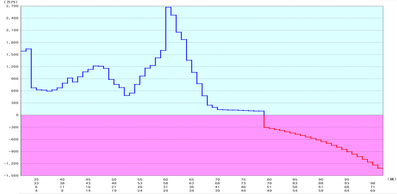 下のグラフは金融資産残高を表し、横軸は同じく年齢、縦軸は金融資産残高の合計を表します。つまり、0を下回ると赤字つまり資金ショートを起してしまいます。