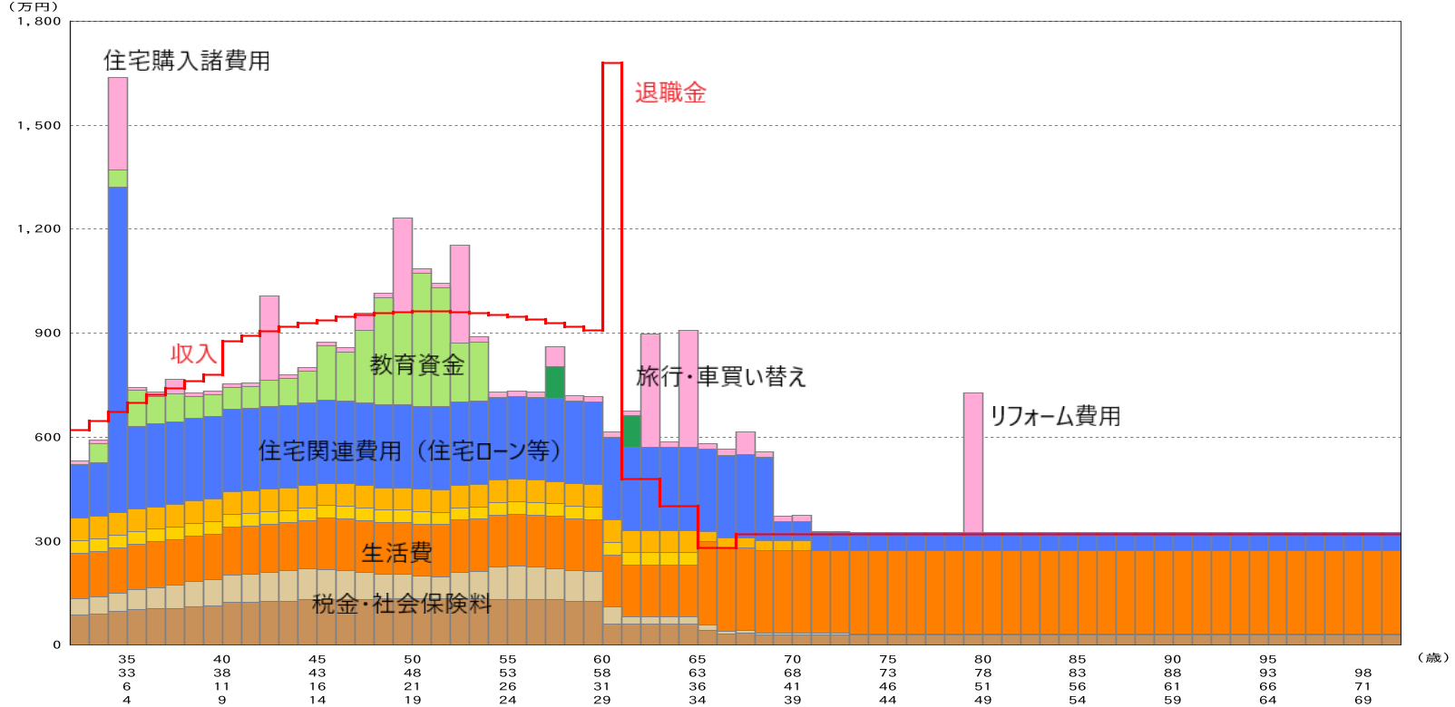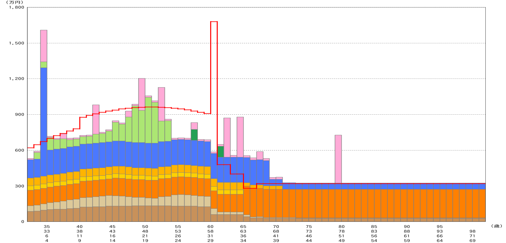 上のグラフは年度別の収支を表したもので、横軸は年齢を表し縦軸は収支の各金額を表します。また、赤い折れ線が収入、色別の棒グラフが支出になります。色の内訳は大きくオレンジは生活費、その下のベージュ・茶色が税金・社会保険料、青が住宅ローン、緑が教育資金、ピンクが車の買い替えや旅行・リフォーム費用などの支出になります。