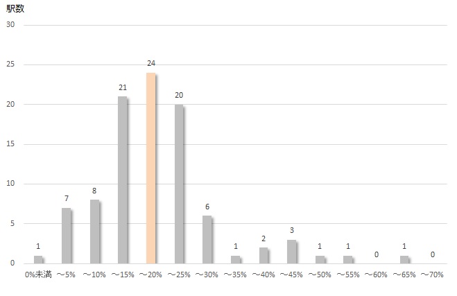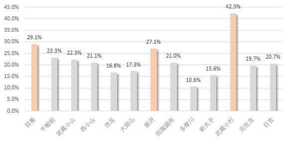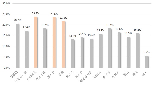 マイナスを記録したのは1駅、それ以外は上昇率0%以上を記録しました。平均は14.3%となり、前後±5%内で約2/3を占めます。全国的には2.5%の上昇率とのデータもありますので、東急沿線の上昇率は高い部類に入ると言えます。続きを読む