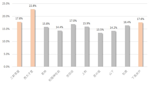 世田谷線内で突出した値の駅はなく、13%~18%の間にほぼ全駅が収まり、上昇率1位の西太子堂駅のみ20%を超えています。1位の西太子堂駅と2位の三軒茶屋駅は、田園都市線内で取り上げた三軒茶屋駅の再開発による地価上昇が要因と考えられます。また、三軒茶屋から西太子堂駅にかけてのエリアは東京都が制定した「住宅市街地整備計画」の整備地区・重点整備地区内になっています。そのため、道路拡張が進んだり、住宅建て替え需要が増えたりと街の活性化につながったものと考えられます。続きを読む