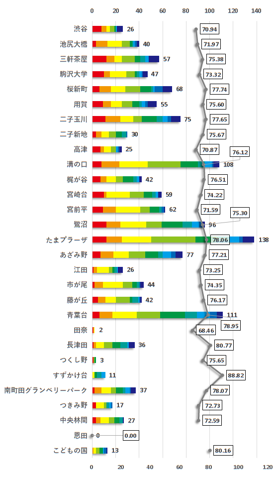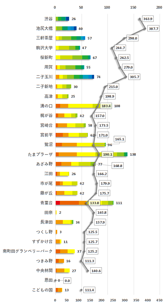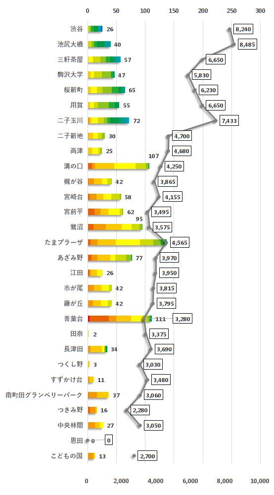 棒グラフの推移を見ると、東京都エリアでは緑が強く、神奈川県エリアではオレンジが強く出ていることが分かります。また、折れ線の中央値を見ても、二子玉川駅と二子新地駅の間で値が大きく変化していることが分かります。