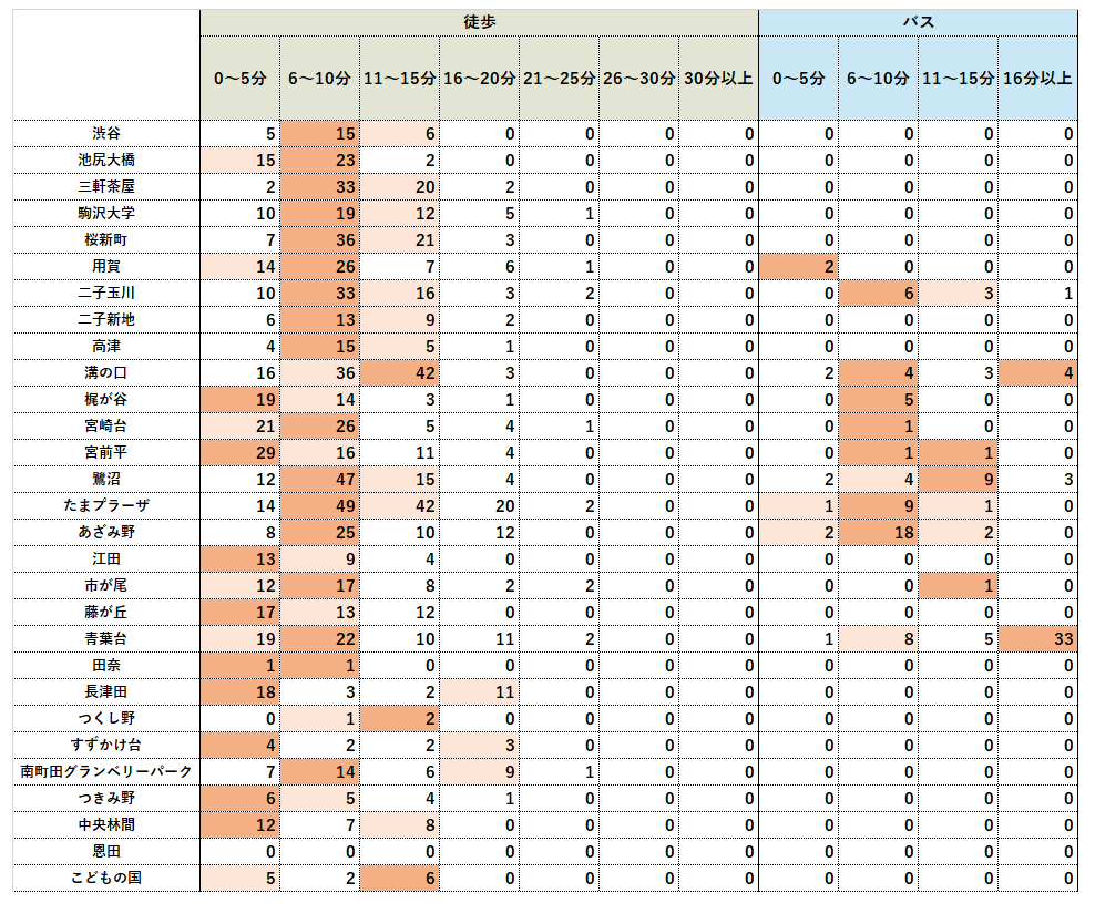 東京都エリアでは徒歩10分以内の物件が多く、神奈川県エリアでは徒歩5分以内とより駅近の物件で多く取引されています。また、田園都市線はバス利用が便利なエリアも多く、バス利用エリアの取引件数の違いが駅によって顕著に出ています。