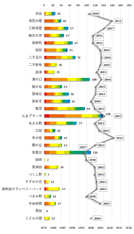 グレーの折れ線グラフは各駅の中央値を示しています。(座標下軸、単位:西暦年)
