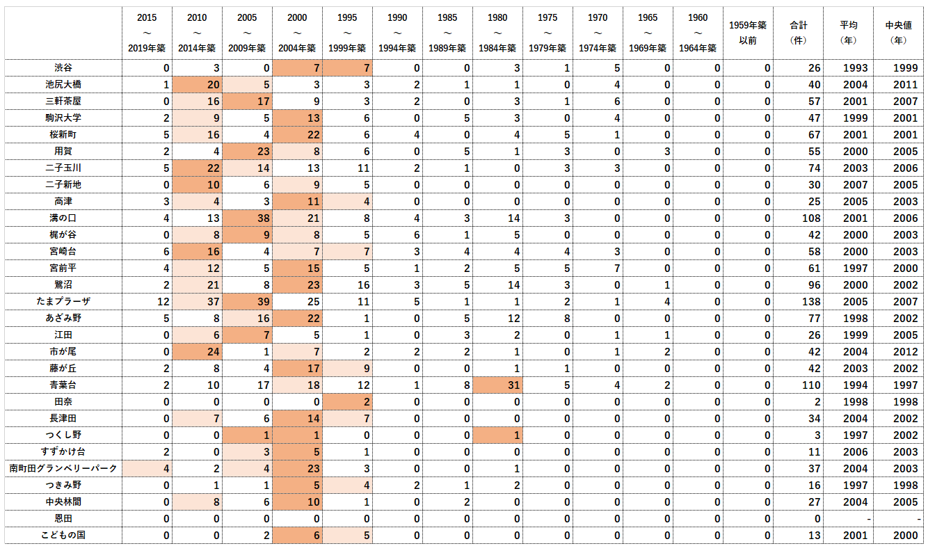 ■田園都市線・こどもの国線の取引物件 竣工年|2019年取引件数|一覧表