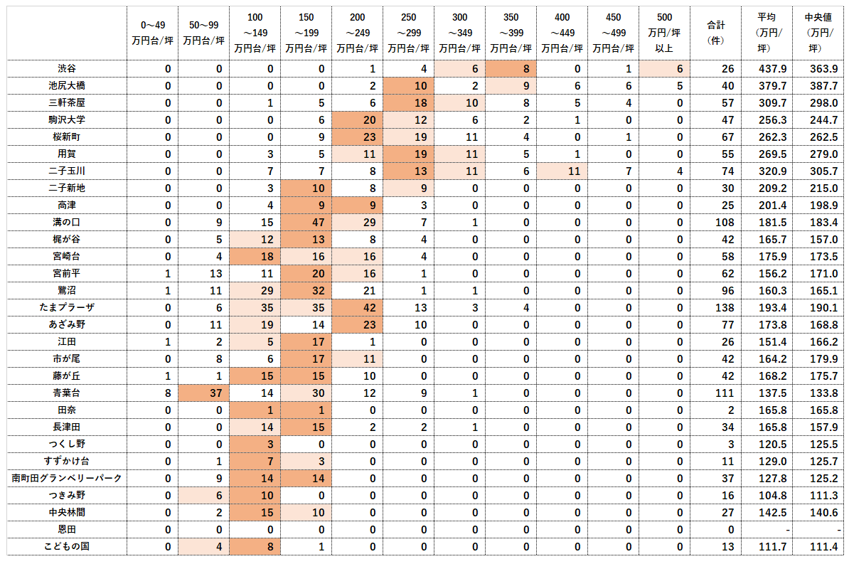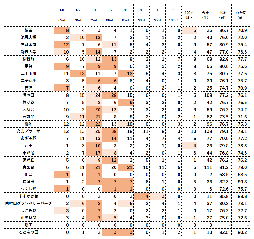濃いオレンジの網掛けはその駅の中で最も取引件数の多い面積帯、次点は薄いオレンジの網掛けをしています。