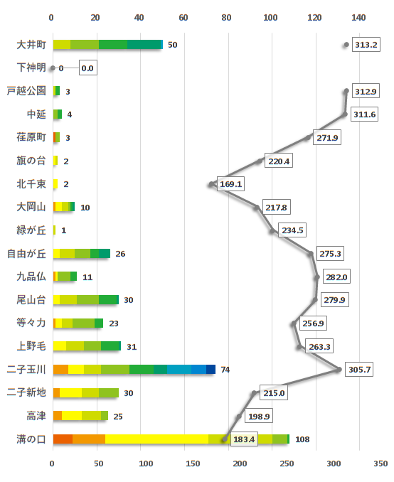 まず取引実績件数についてですが、大井町線はエリアにより件数の差が顕著に表れている路線と言えます。最も件数の多い溝の口駅、次点の二子玉川駅、大井町駅という3駅は件数の多さが目立ち、自由が丘駅~溝の口駅の間は各駅の取引実績件数が20~30件台と比較的近い数になっています。下神明駅から緑が丘駅の間は取引件数が少なく、10件以下になっています。これはマンション物件の多いエリアと戸建て物件の多いエリアの違いが明らかに分かれている路線と言えます。