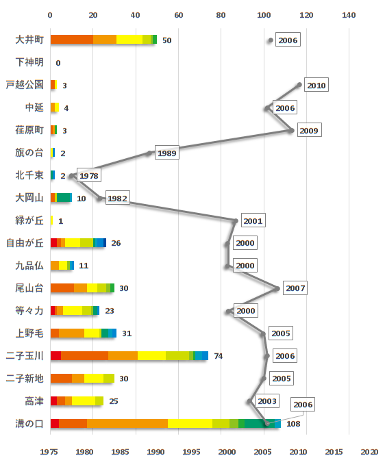 グレーの折れ線グラフは各駅の中央値を示しています。(座標下軸、単位:西暦年)