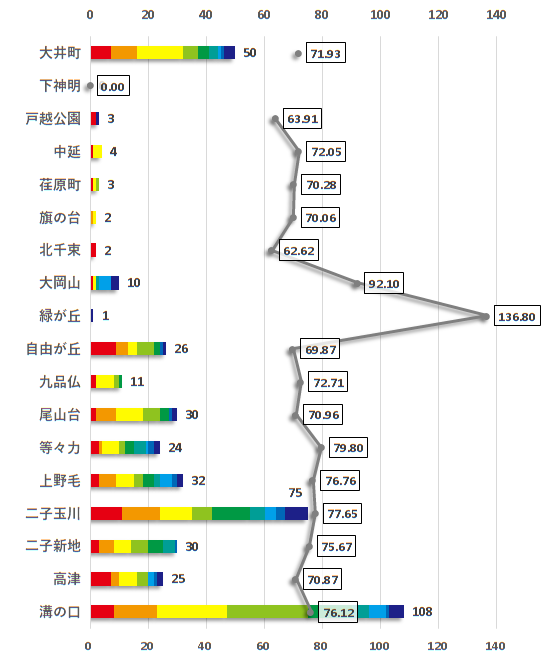 坪単価としてみると、棒グラフは全体的に黄色から緑色が強く出ています。その中で二子玉川駅は坪単価の値の大きい青の色が目立っています。また、取引件数の少ない下神明駅から緑が丘駅については物件が少なく、それにより偏りがあることが想定されるため、今後この値を大きく上回る値での取引の可能性も充分に考えられます。