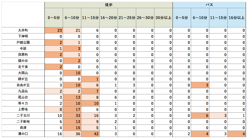 大井町線の特徴として、大井町駅から北千束駅の間は徒歩5分以内と非常に駅近の物件の実績件数割合が大きく、大岡山駅から溝の口駅の間は5分以上の実績件数の割合が大きくなっています。これは大井町駅から北千束駅の間の区間はマンション物件が駅近に限られ、特に駅徒歩11分以上のエリアは戸建てメインと考えられます。