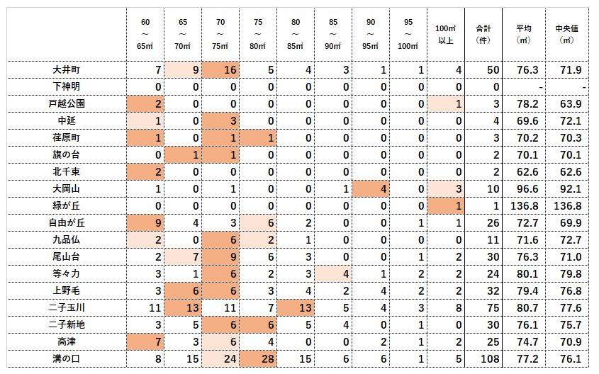 濃いオレンジの網掛けはその駅の中で最も取引件数の多い面積帯、次点は薄いオレンジの網掛けをしています。