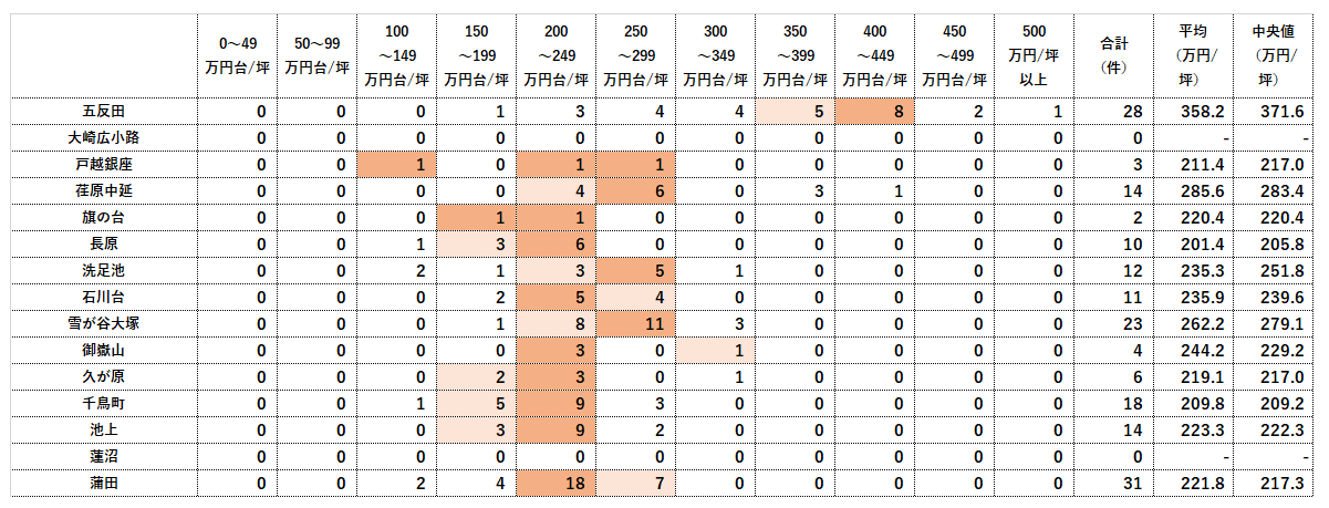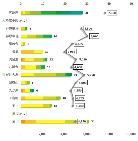 成約価格でお伝えした傾向が坪単価に落とし込むとより顕著になりました。積み上げの棒グラフでは五反田駅の青色が目立ち、池上線内でも坪単価が高い値であることが分かります。また、反対に蒲田駅では坪単価に落とし込むと沿線内でも比較的安価な駅の部類に入ります。これは先述の通り、他の駅に比べると駅から離れた物件の数が多いことが影響していると言えそうです。