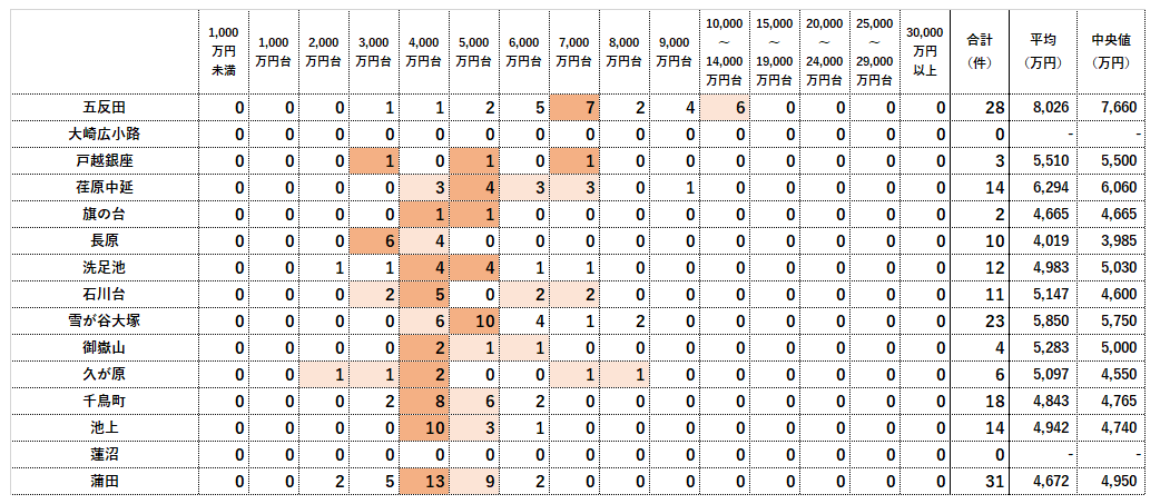 中央値でみると、五反田駅のみ7,000万円台半ばと突出しています。唯一3,000万円台の長原駅は専有面積が他駅に比べ小さい物件が多いことが影響していると考えられます。荏原中延駅、雪が谷大塚駅は反対に築年数の浅い物件が多いために中央値を引き上げていると推測されます。