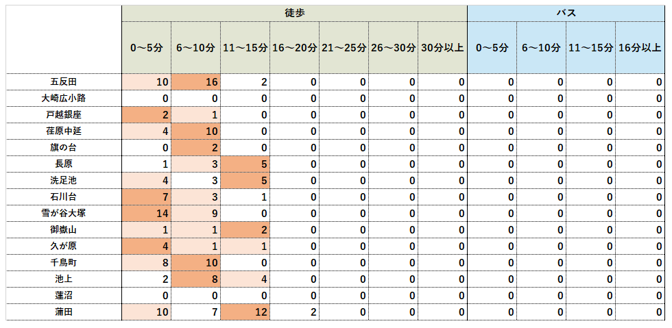 前述の通り、池上線は駅同士の距離が比較的近いことも多く、駅周辺の広範囲に商業施設の広がっている蒲田駅を除く各駅で、全て徒歩15分以内におさまっています。徒歩10分までに全件登録されている駅もありますので、駅近物件の取引需要が高いことが伺えます。