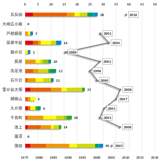 グレーの折れ線グラフは各駅の中央値を示しています。(座標下軸、単位:西暦年)