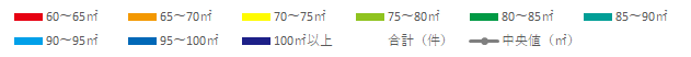 積み上げ棒グラフは専有面積の該当件数を面積帯により色分けしたもので、赤が60~65㎡、カラーグラデーションで青に近づくにつれ面積帯が大きいものを示し、濃青が100㎡以上を示します。(座標上軸、単位:件)