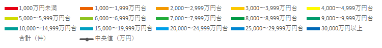 積み上げ棒グラフは成約価格の該当件数を価格帯により色分けしたもので、赤が1,000万円未満、カラーグラデーションで青に近づくにつれ価格帯が大きいものを示し、濃青が3億円以上を示します。(座標上軸、単位:件)グレーの折れ線グラフは各駅の中央値を示しています。(座標下軸、単位:万円)