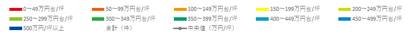 積み上げ棒グラフは成約坪単価の該当件数を価格帯により色分けしたもので、カラーグラデーションで赤から青に近づくにつれ価格帯が大きいものを示します。(座標上軸、単位:件)