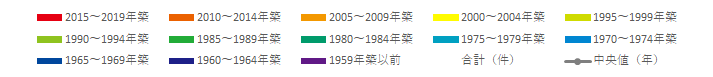 積み上げ棒グラフは成約価格の該当件数を価格帯により色分けしたもので、赤が築5年以内の新しいもの、カラーグラデーションで青に近づくにつれ竣工年が以前のものになり、濃青が1959年以前を示します。(座標上軸、単位:件)