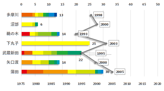グレーの折れ線グラフは各駅の中央値を示しています。(座標下軸、単位:西暦年)