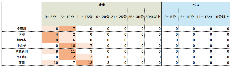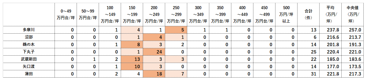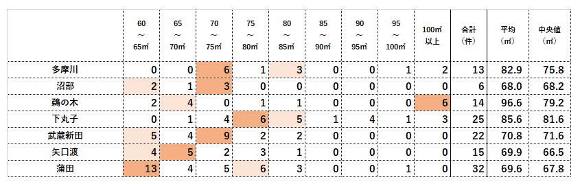 濃いオレンジの網掛けはその駅の中で最も取引件数の多い面積帯、次点は薄いオレンジの網掛けをしています。