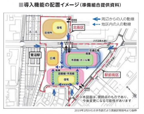 計画案では駅前街区(現在のバスロータリー、フレル鷺沼周辺)と北街区(宮前平寄りの道路を挟んだ三菱UFJ銀行、横浜銀行エリア)に分け、居住機能、商業機能、文化・交流機能(市民館・図書館・ホール)、子育て機能、業務機能、交通広場等を具備した複合施設に生まれ変わる予定です。