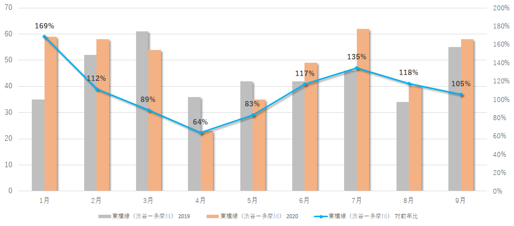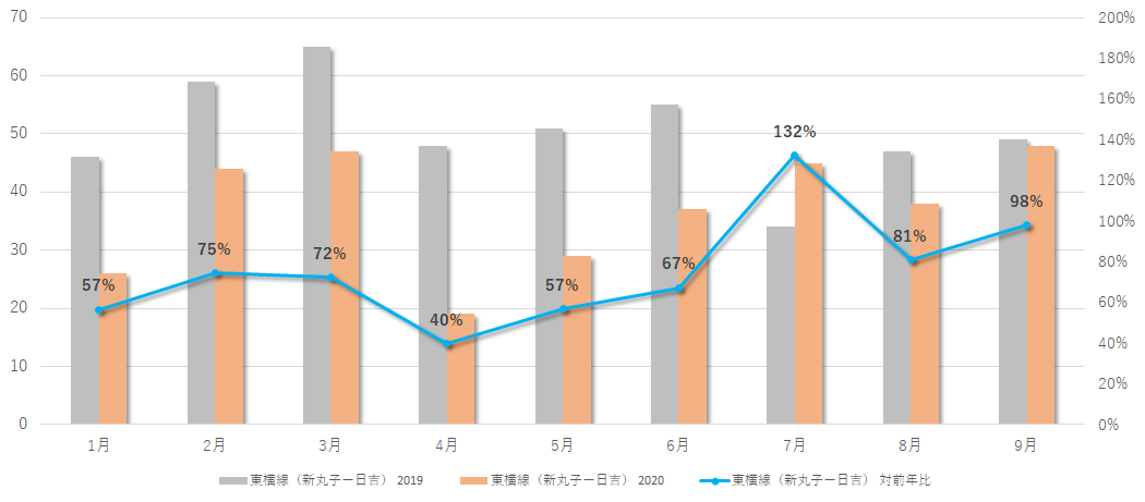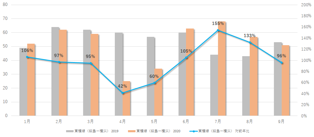 ■成約件数 月別比較(2019年・2020年/青は対前年比)東横線:渋谷駅-多摩川駅