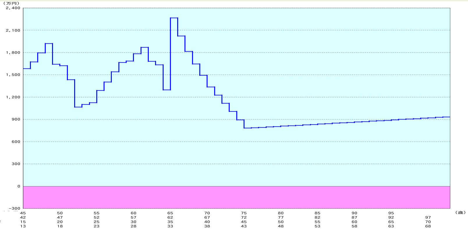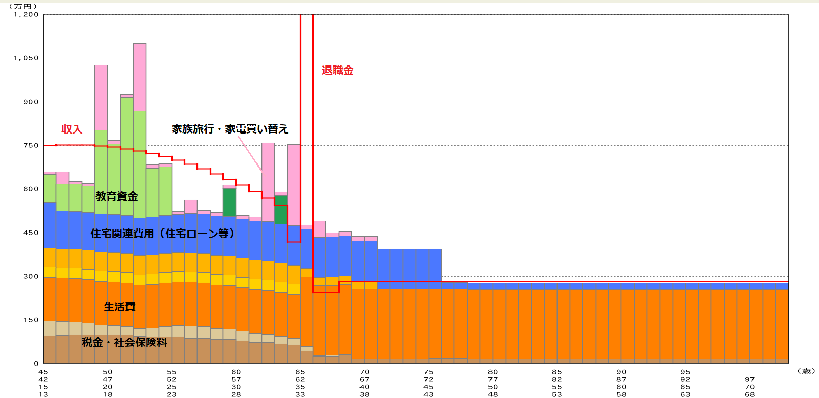 上のグラフ①は年度別の収支を表したもので、横軸は年齢を表し縦軸は収支の各金額を表します。また、赤い折れ線が収入、色別の棒グラフが支出になります。色の内訳は大きくオレンジは生活費、その下のベージュ・茶色が税金・社会保険料、青が住宅ローン、緑が教育資金、ピンクが車の買い替えや旅行・リフォーム費用などの支出になります。