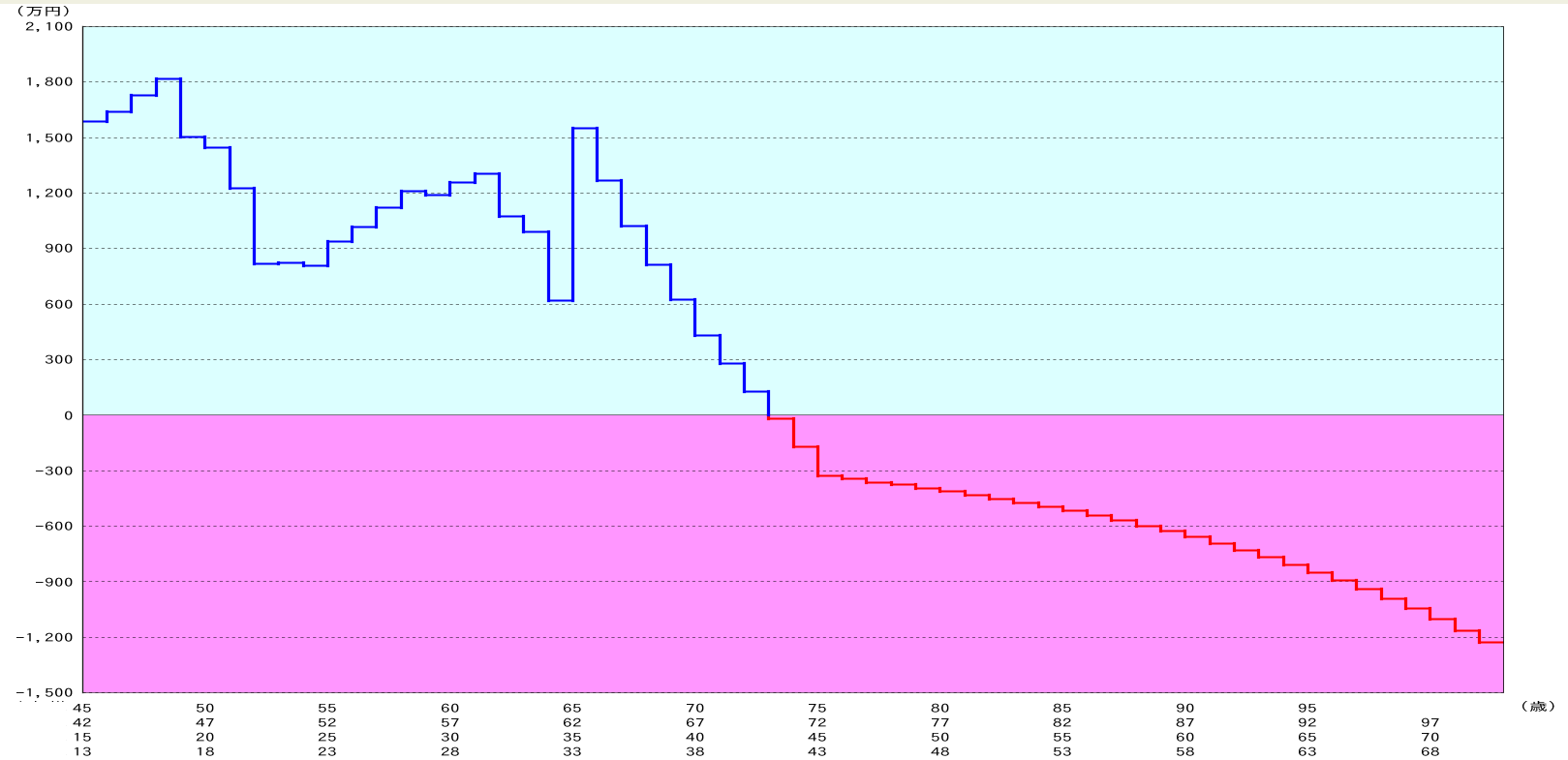 下のグラフ②は金融資産残高を表し、横軸は同じく年齢、縦軸は金融資産残高の合計を表します。つまり、0を下回ると赤字つまり資金ショートを起してしまいます。
