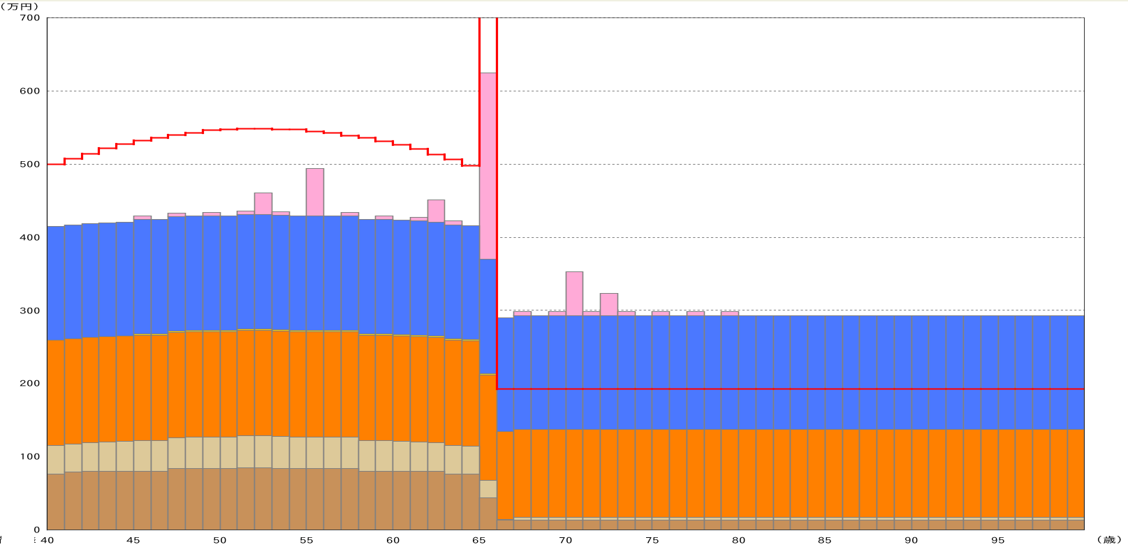 上のグラフ①は年度別の収支を表したもので、横軸は年齢を表し縦軸は収支の各金額を表します。また、赤い折れ線が収入、色別の棒グラフが支出になります。色の内訳は大きくオレンジは生活費、その下のベージュ・茶色が税金・社会保険料、青が住宅ローン、ピンクが車の買い替えや旅行・リフォーム費用などの支出になります。