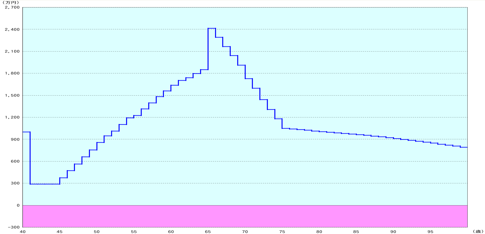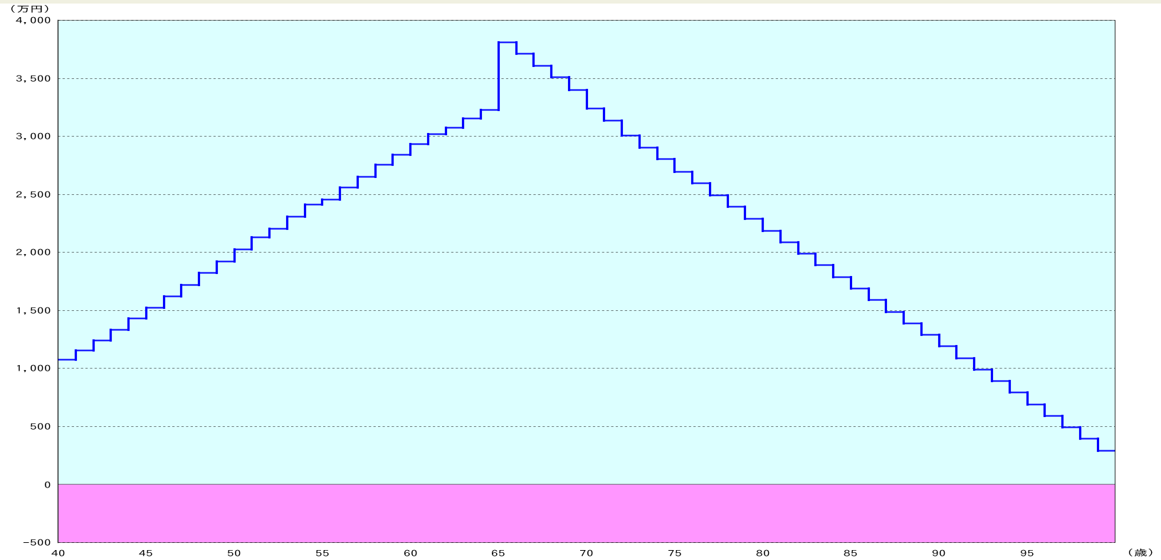 下のグラフ②は金融資産残高を表し、横軸は同じく年齢、縦軸は金融資産残高の合計を表します。つまり、0を下回ると赤字つまり資金ショートを起してしまいます。