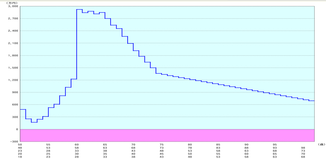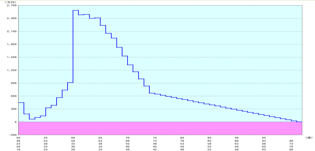 グラフ②は金融資産残高を表し、横軸は同じく年齢、縦軸は金融資産残高の合計を表します。0を下回ると赤字つまり資金ショートを起してしまいます。