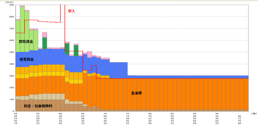 グラフ①は年度別の収支を表したもので、横軸は年齢を表し、縦軸は収支の各金額を表します。また、赤い折れ線が収入、色別の棒グラフが支出になります。色の内訳は、大きなオレンジの部分は生活費、その下のベージュ・茶色が税金・社会保険料、青が住宅ローン、緑が教育資金、ピンクが車の買い替えや旅行・リフォーム費用などの支出になります。