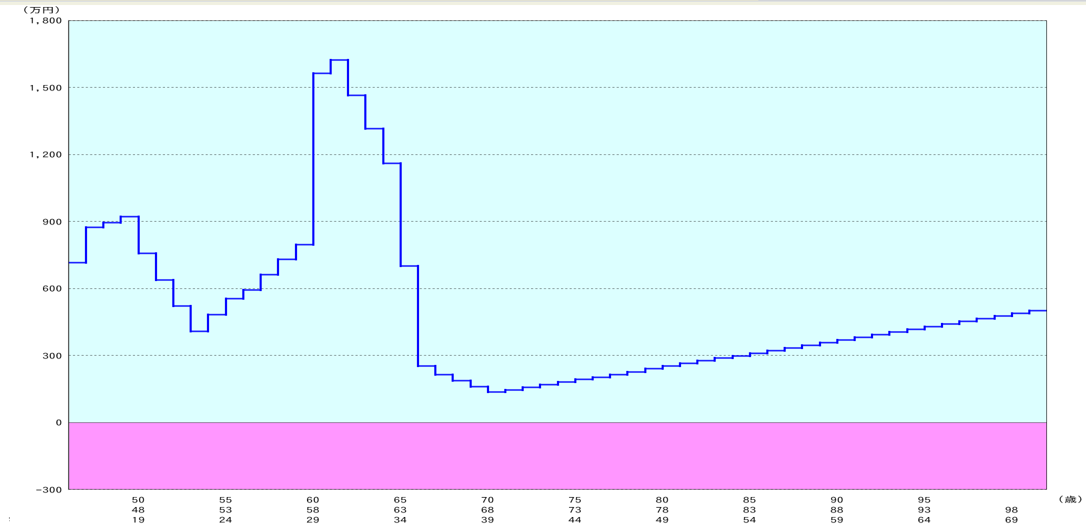グラフ②は金融資産残高を表し、横軸は同じく年齢、縦軸は金融資産残高の合計を表します。0を下回ると赤字つまり資金ショートを起してしまいます。