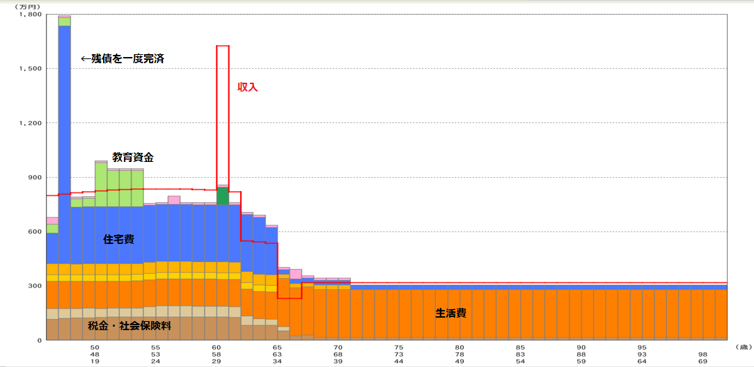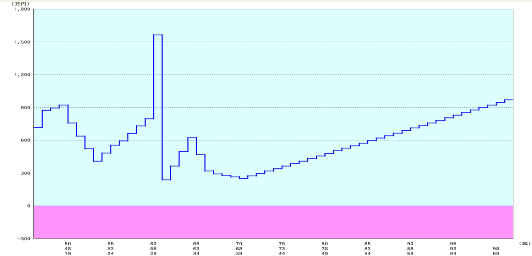 老後の残高ショートは回避できそうですが、逆に53歳頃に資金ショートを起こしてしまいますね。この期間はまだお子さまの教育費が必要な頃です。焦らずに手元に資金を残しておきましょう。