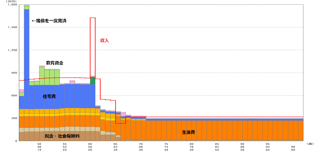 グラフ①は年度別の収支を表したもので、横軸は年齢を表し、縦軸は収支の各金額を表します。また、赤い折れ線が収入、色別の棒グラフが支出になります。色の内訳は、オレンジの大きい部分は生活費、その下のベージュ・茶色が税金・社会保険料、青が住宅ローン、緑が教育資金、ピンクが車の買い替えや旅行・リフォーム費用などの支出になります。
